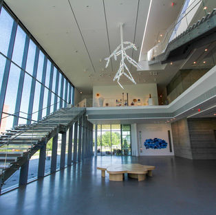 In addition to the multiple cantilevers, the structure features a custom designed structural steel curtain wall system, a large retractable overhead door to create an open-air lecture hall/auditorium during suitable weather, a glass bottom bridge connecting the addition to the existing museum, a stair built integrally with the curtain wall and a shallow water feature surrounding the building at the ground floor level. The roof over the lecture hall is designed to accommodate outdoor seating/gathering. The structure consists of a steel frame utilizing steel joists at the roof and composite steel beams at each floor level. The core of the building has reinforced concrete walls for the stairs, elevators, and mechanical chases. These walls, in addition to the expressed concrete walls for the auditorium, serve as shear walls to provide the lateral bracing system for the building. The building is founded on end-bearing auger-cast concrete piles.